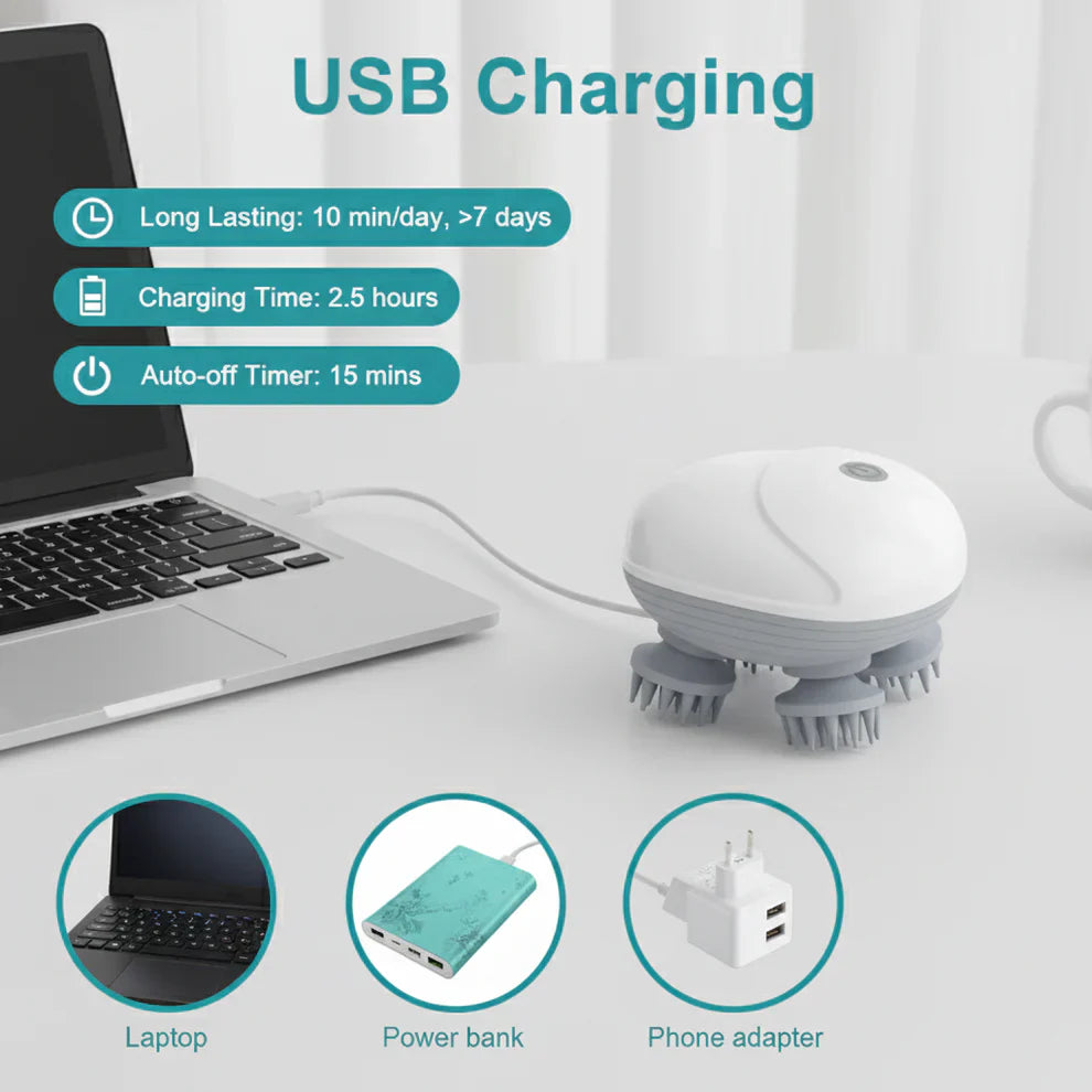The Electric Head & Body Massager is a compact, cordless, IPX7-waterproof device that uses rotating technology to relieve headaches, reduce tension, and boost scalp circulation. With adjustable speeds, soft washable silicone heads, and USB rechargeable power, it’s ideal for massaging the head, neck, shoulders, back, and even pets. Lightweight and travel-friendly at 12 × 15 × 15 cm, it delivers convenient, portable relaxation anytime.
