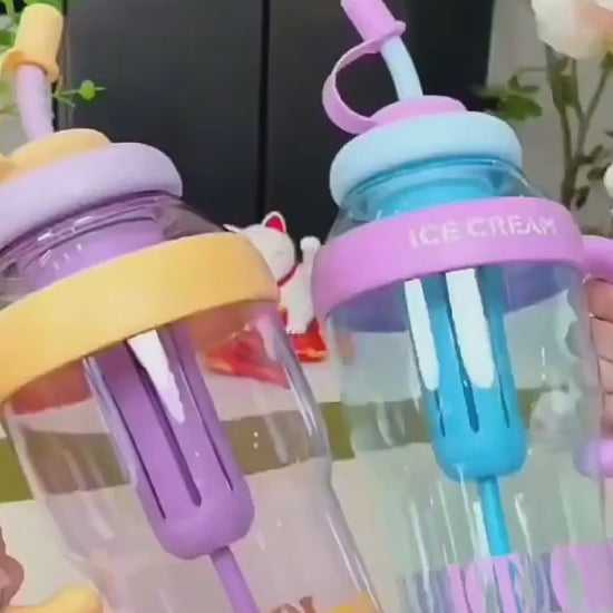 The Ice Cream Bottle is a fun, kid-friendly hydration essential designed with a playful style that children will love. With a large 1300ml capacity, it keeps kids hydrated longer during school, playtime, sports, or travel. The locking flip straw allows easy one-handed sipping while helping prevent leaks, and the leak-proof lid with a secure silicone seal keeps backpacks mess-free. Its insulated double-wall design helps drinks stay cooler longer with less condensation, while the wide mouth opening makes it easy to add ice or clean thoroughly. A sturdy, easy-carry handle and clear measurement scale make this bottle both practical and fun for everyday use.