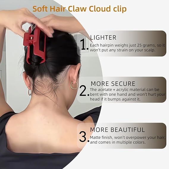 Experience all-day cloud-like comfort with Cloud Claws! Made from a cutting-edge TPEE-Silicone blend, these clips are designed for weightless wear, eliminating scalp pressure, tension headaches, and hair dents. The ergonomic, rounded edges gently conform to your head, while the workout-proof non-slip grip ensures your hair stays secure through every activity. From thick ponytails to fine hair and curly updos, the durable, unbreakable design holds up even in the shower, making it your go-to for any hairstyle. Available in 4 trendy colors and packaged in a premium gift box, these clips are the perfect combination of style, comfort, and durability.